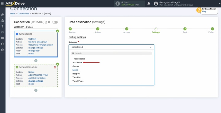 Para continuar con la integración de Notion con Webflow, conecte su cuenta de Notion a ApiX-Drive y configure el destino de los datos.