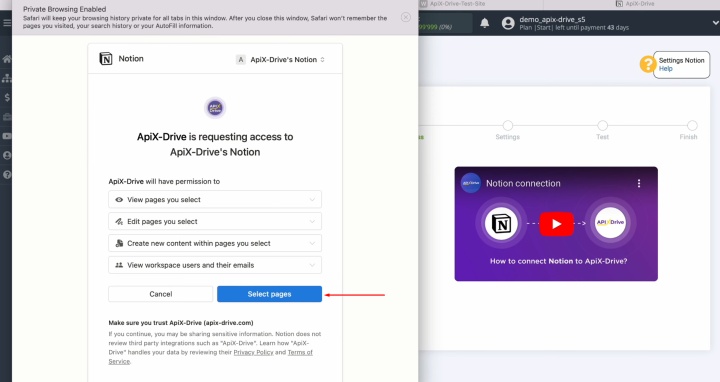Otorgue acceso a sus bases de datos de Notion haciendo clic en "Select pages".