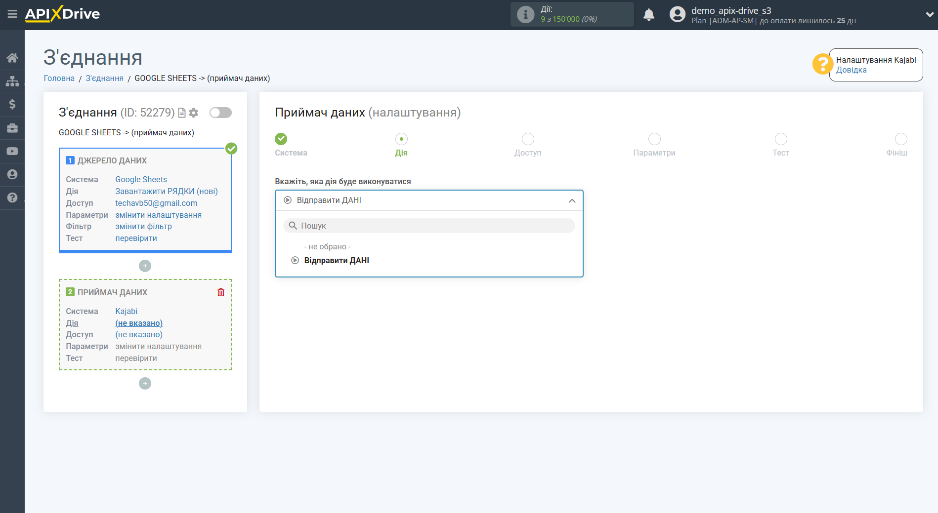 Наступний крок - вибір акаунту Kajabi, в який відбуватиметься відправка даних.